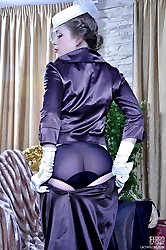 Classy hottie changes her negligee for sheer panties and gartered stockings