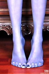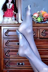 Upskirt teaser in open toe stilettos and tights flashes her feet and pussy